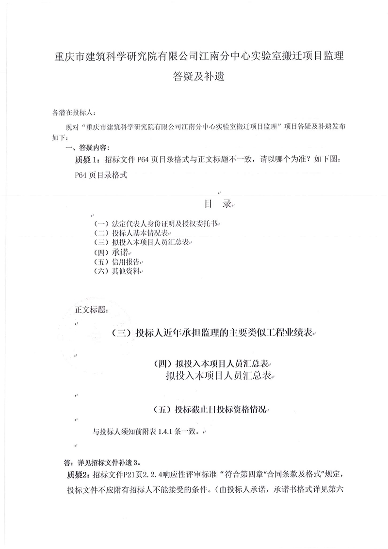 現(xiàn)對“重慶市建筑科學(xué)研究院有限公司江南分中心實驗室搬遷項目監(jiān)理”項目答疑及補遺發(fā)布如下: