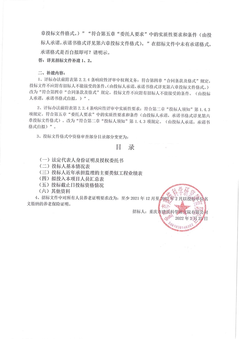 4、招標(biāo)文件中對所有人員養(yǎng)老證明要求改為:至少2021年12月至2022年2月以投標(biāo)單位名義繳納的養(yǎng)老保險證明。