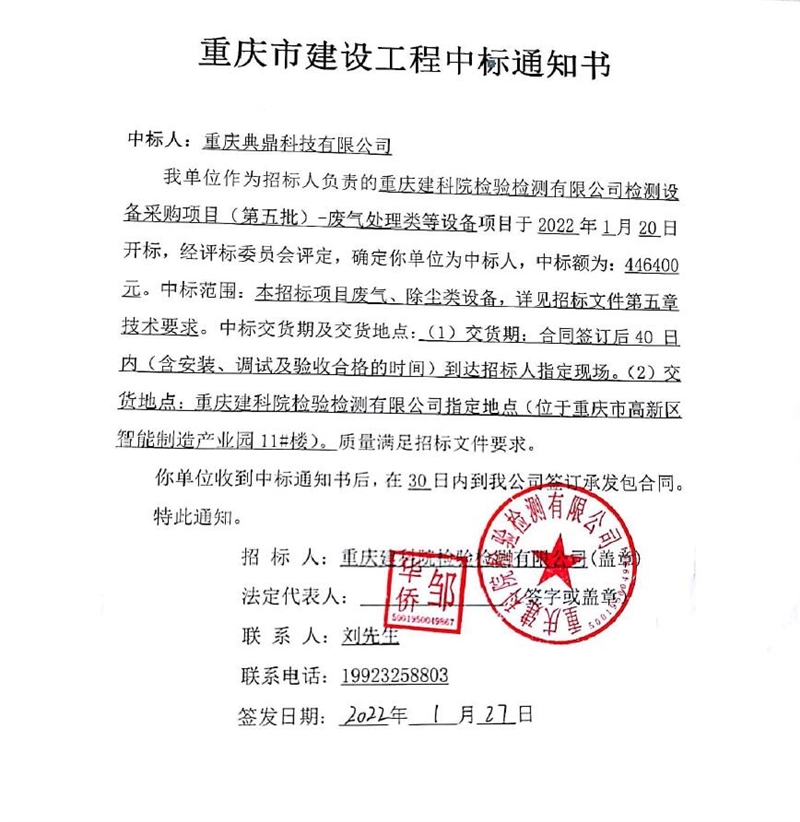 重慶建科院檢驗檢測有限公司委托重慶市工程管理有限公司對我公司檢測設(shè)備采購項目(項目號:CQEM-ZB-22002 )重慶建科院檢驗檢測有限公司檢測設(shè)備采購項目(第五批)-廢氣處理類等設(shè)備進行了公開招標(biāo)采購,現(xiàn)已完成全部采購程序。確認(rèn)重慶典鼎科技有限公司為檢測設(shè)備采購項目(第五批)-廢氣處理類等設(shè)備采購項目中標(biāo)人,中標(biāo)價為446400元(大寫:肆拾肆萬陸仟肆佰元整)。